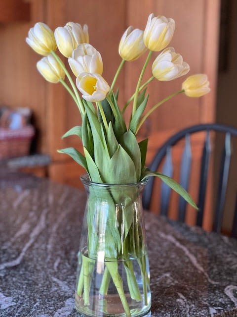Approach the door to find a thoughtful friend bearing gifts of lemon cake and tulips. Teary and touched, you accept the offering, give sincere thanks, and step back inside.